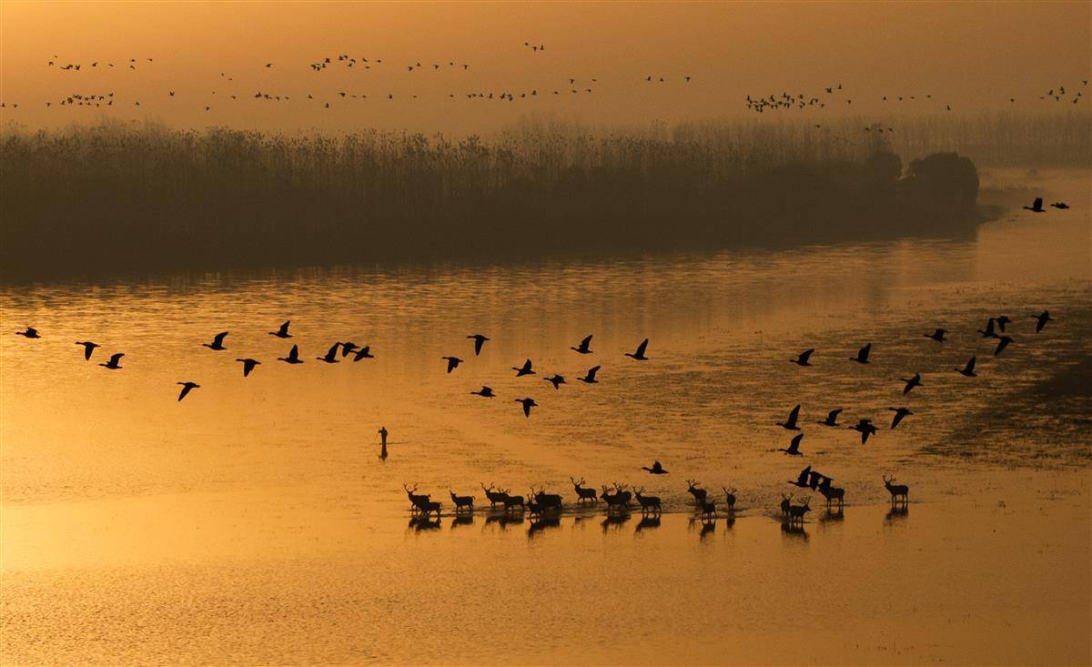 11月25日凌晨,在石首麋鹿国家级自然保护区主区内,一群麋鹿在鸟儿的陪伴下开始了八公日。 (湖北日报全媒体记者柯浩、通讯员杨涛摄)
